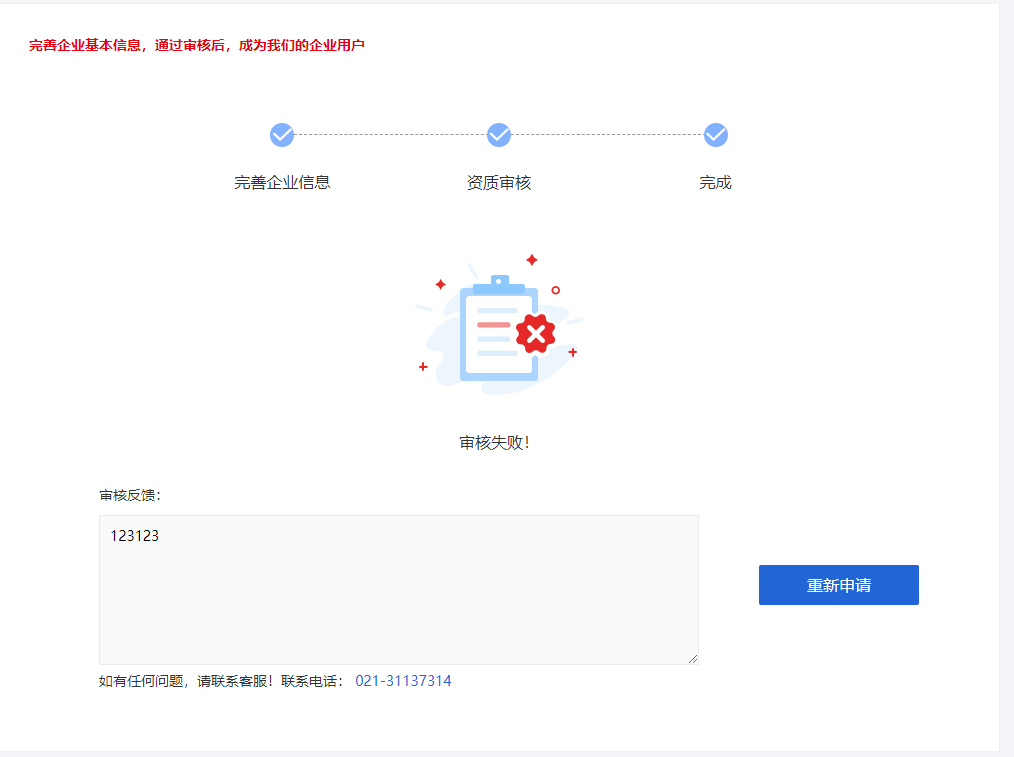 审核未通过。需要您根据”审核反馈“重新上传正确的企业认证信息。