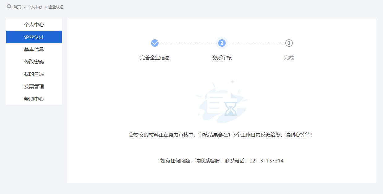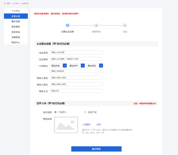 2.进入“个人中心”的“企业认证”模块,企业认证中有红色*标记的信息为必填项,必须全部填选完毕后才可提交审核。