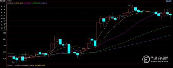 周三国际现货白银亚市早盘开于25.83美元/盎司,日内最高上探26.64美元/盎司,最低录得25.74美元/盎司,最终收于26.53美元/盎司,日内上涨0.70美元/盎司,日涨幅2.71%。