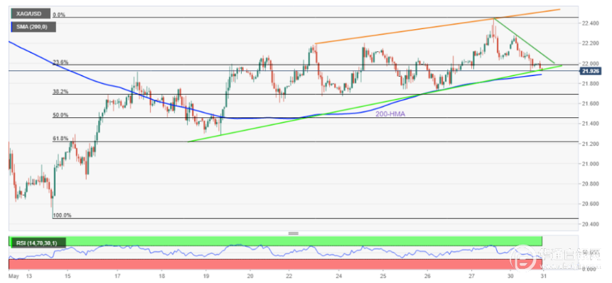 从5月19日开始的斜向上趋势线领先200小时移动均线,限制了银价在21.90-85美元附近疲弱。