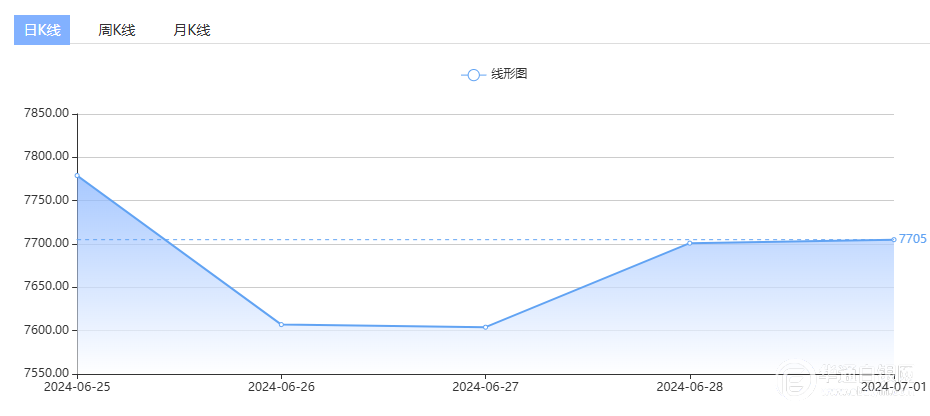 7月1日,华通国标一号银定盘价报7693元/千克,较上一交易日下跌8元/千克。