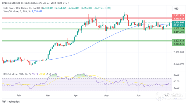 如果金价收于2350美元上方,则将向最近的阻力位2390-2400美元移动。