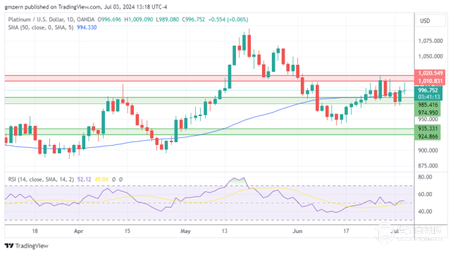 铂金在波动的交易中基本持平。从技术面来看,铂金仍处于975美元支撑位和1020美元阻力位之间。