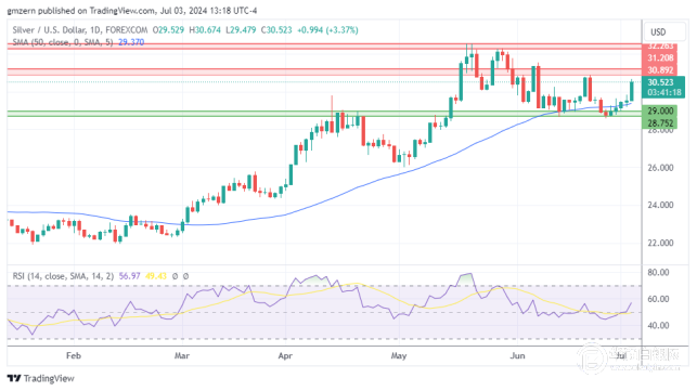 白银最近的阻力位位于30.90-31.20美元区间。突破31.20美元将推动银价向阻力位32.25-32.50美元迈进。