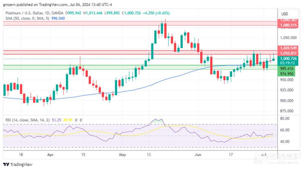 铂金试图突破1010-1020美元阻力位,但失去了动力并回落。