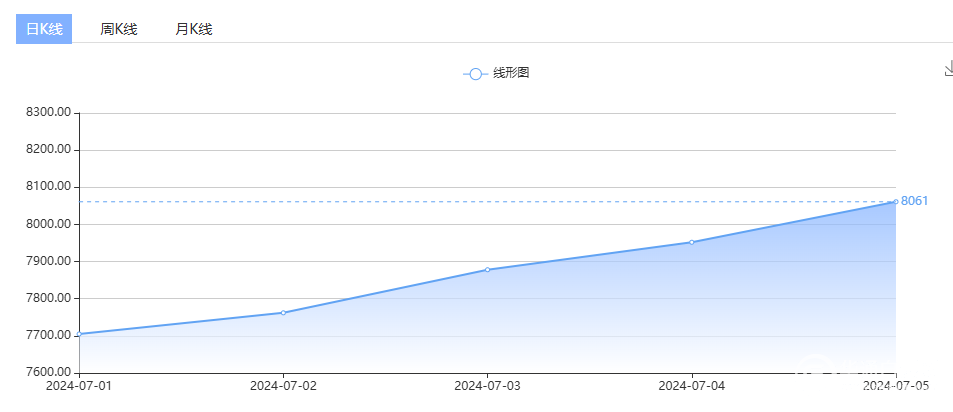 7月5日,上海华通铂银国标一号银定盘价报8012元/千克,较上一交易日上涨60元/千克。