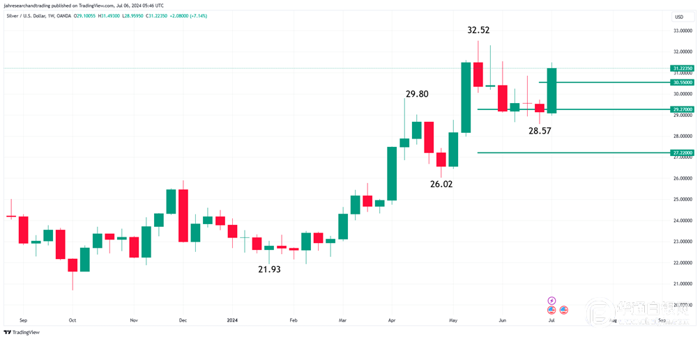 银价周五飙升至逾一个月高位,此前美国就业数据显示就业市场走软。这加剧了人们对美联储9月份降息的预期。推动银价当周上涨的因素包括收益率下降和美元走软。上周,白银收于31.22美元,上涨2.08美元,涨幅7.14%。