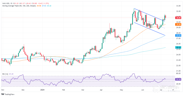 【华通网7月9日讯】•银价在触及日高点31.36美元后回落至31.00美元下方,形成看跌孕线形态。
