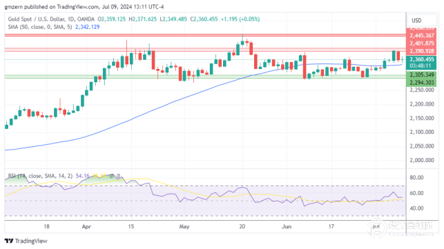 如果金价成功收于2370美元上方,则将向阻力位近期高点2390-2400美元附近移动。