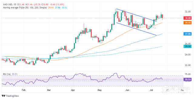 【华通网7月15日讯】•白银回撤逾2%,但仍守在30.78美元“双底”颈线的上方。