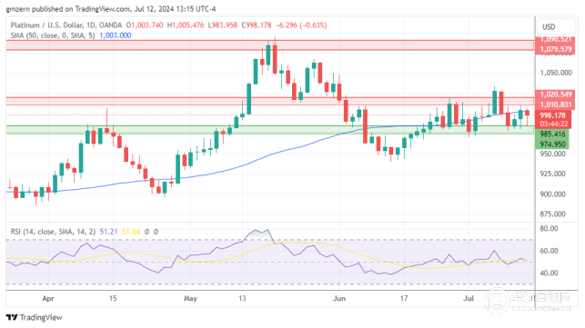 铂金仍位于975-985美元支撑位和1010-1020美元阻力位之间。