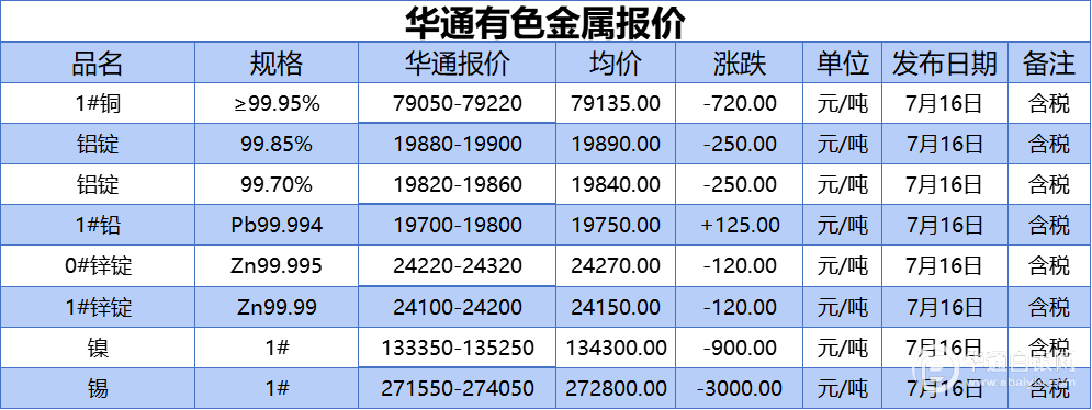 华通网7月16日讯:1#、铝锭(99.85%)、铝锭(99.70%)、1#铅、1#、0#锌、镍、锡报价