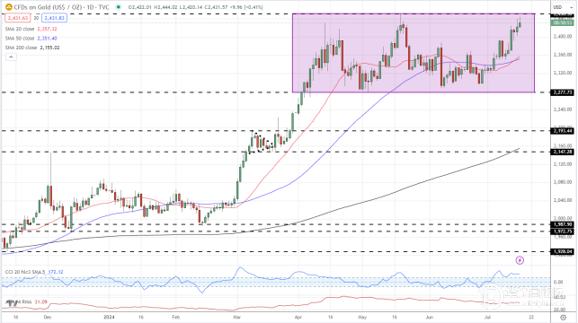 黄金价格继续走高,并将测试5月20日2450美元的历史高点。市场再次猜测美联储将在9月中旬降息25个基点,这推动了最新一轮上涨。金融市场目前预计,美国今年总共将降息65个基点,因此第三次降息预期为50%。