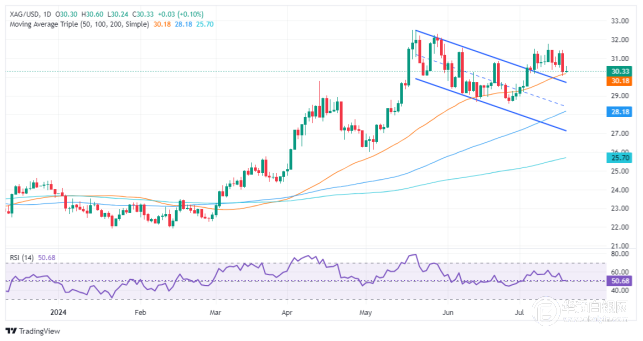 为了继续看涨,白银必须攀升至30.50美元上方,这样多头才能测试31.00美元关口。如果进一步走强,白银的下一个阻力位将是7月17日高点31.42美元,随后将测试7月12日高点31.75美元。