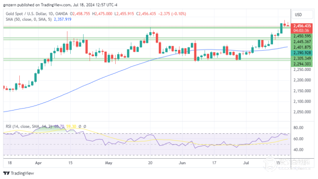 【华通网7月19日讯】•在获利回吐的推动下,金价正朝着2450美元水平移动。