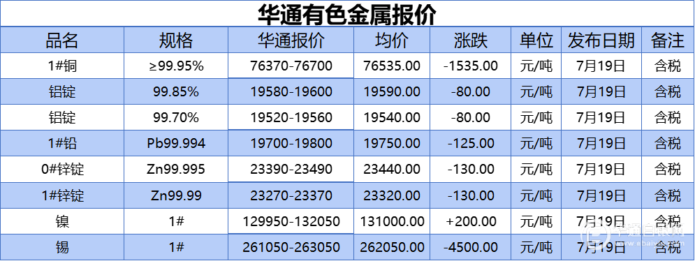 华通网7月19日讯:1#、铝锭(99.85%)、铝锭(99.70%)、1#铅、1#、0#锌、镍、锡报价