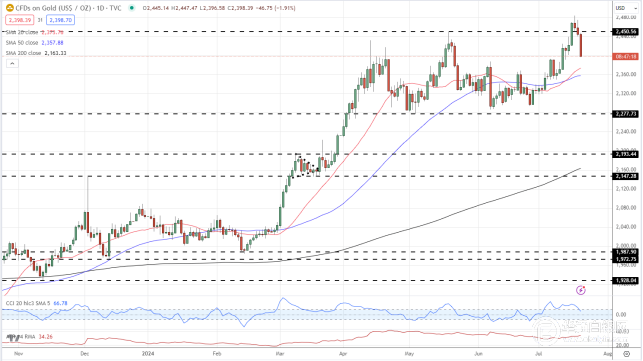 黄金交易价格为2400美元/盎司。任何进一步的抛售都可能很有限。阻力位转支撑位2350美元/盎司至2370美元/盎司区间包含了短期和中期均线,应会保持并增加额外的支撑。