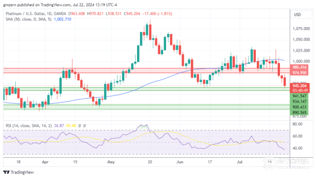 如果铂金跌破935-940美元支撑位,则将向下一个支撑位890-900美元移动。