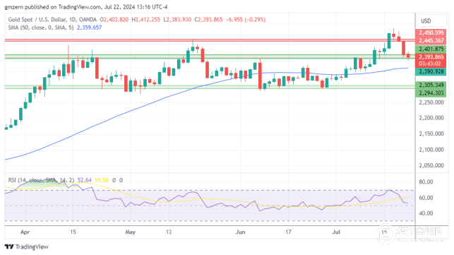 【华通网7月23日讯】•金价试图收于2390美元下方。