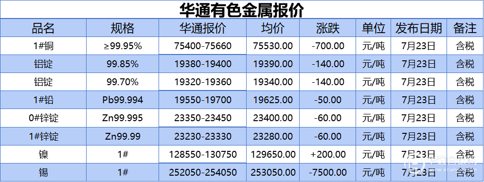 华通网7月23日讯:1#、铝锭(99.85%)、铝锭(99.70%)、1#铅、1#、0#锌、镍、锡报价
