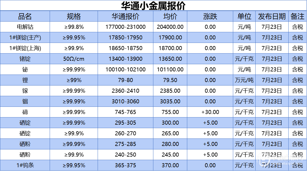 华通网7月23日讯:、1#镁锭(生产)、1#镁锭(上海)、锗锭、铋、锂、镓、铟、碲、硒锭(99.99%)、硒锭(99.9%)、硒粉、硒粉(99.9%)、1#钨条报价