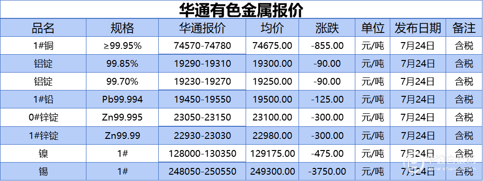 华通网7月24日讯:1#、铝锭(99.85%)、铝锭(99.70%)、1#铅、1#、0#锌、镍、锡报价