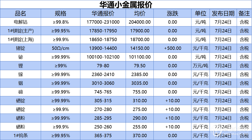 华通网7月24日讯:、1#镁锭(生产)、1#镁锭(上海)、锗锭、铋、锂、镓、铟、碲、硒锭(99.99%)、硒锭(99.9%)、硒粉、硒粉(99.9%)、1#钨条报价