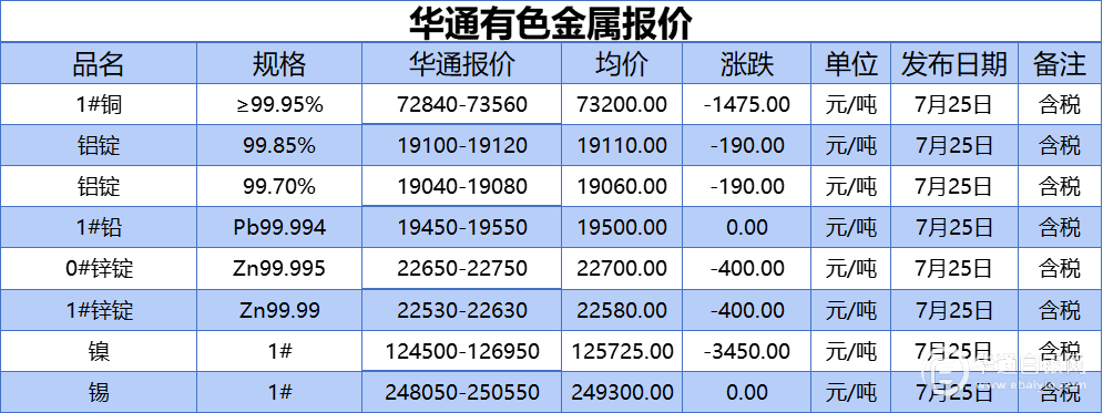 华通网7月25日讯:1#、铝锭(99.85%)、铝锭(99.70%)、1#铅、1#、0#锌、镍、锡报价