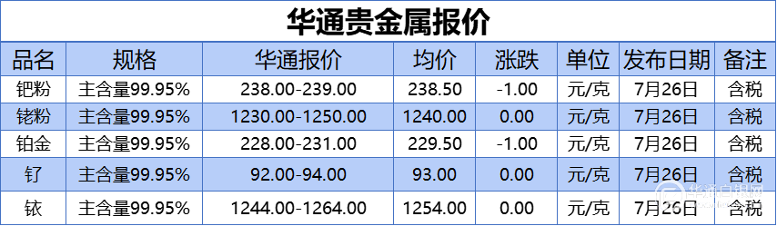 华通网7月26日讯:、、铂金、钌、铱报价