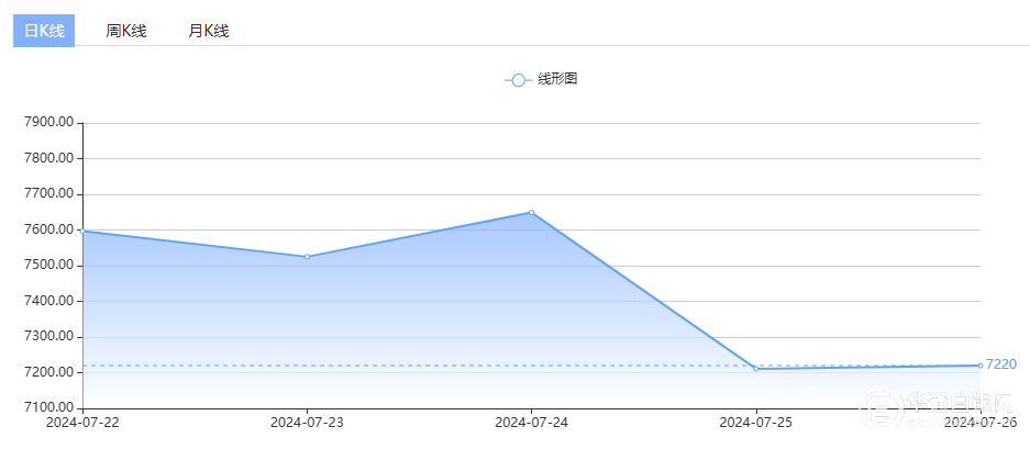7月26日,上海华通铂银国标一号银定盘价报7225元/千克,较上一交易日上涨14元/千克。