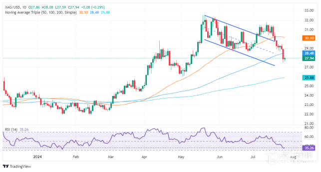 相反,若银价反弹至28.00美元大关以上,这可能会为上涨铺平道路。第一个阻力位将是7月25日高点28.91美元。一旦超过,下一个止损位在29.00美元上方。