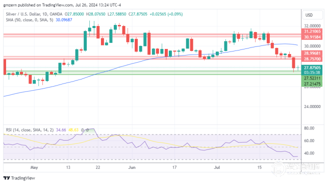 如果银价回落至28.00美元上方,则将向最近的阻力位28.75-28.00美元区间移动。