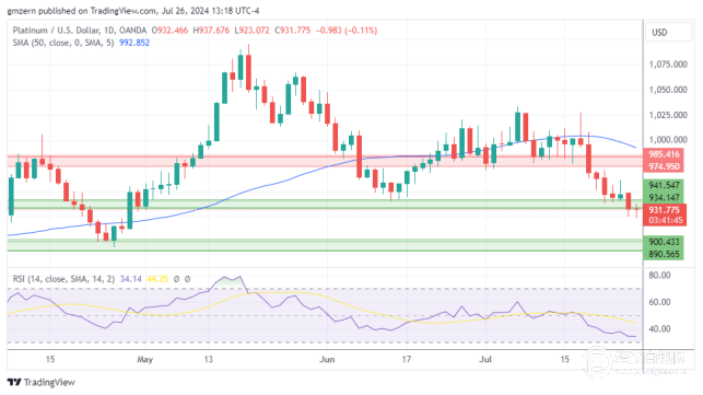 如果铂金保持在935美元下方,则将向下一个支撑位890-900美元移动。
