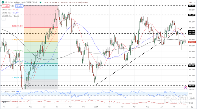 美元交易员现在将关注下周的联邦公开市场委员会会议,等待鲍威尔是否会就即将到来的降息给出进一步的指导。美元指数在38.2%斐波那契回撤104.37和200日简单移动均线的两侧交易,在下周的美联储会议之前,需要一个新的推动力才能推动走势。
