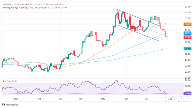 【华通网7月30日讯】•银价跌破100日移动均线28.49美元,报27.86美元。