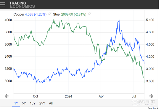 (以美元计算的铜和钢铁价格走势图)