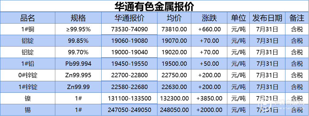 华通网7月31日讯:1#、铝锭(99.85%)、铝锭(99.70%)、1#铅、1#、0#锌、镍、锡报价