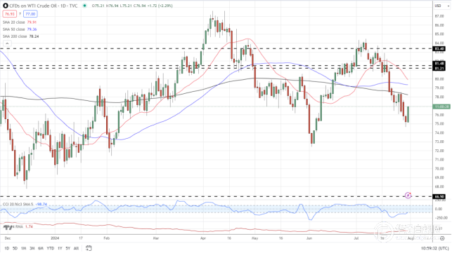 尽管政治局势充其量看起来令人不安,但即将到来的美国事件和数据可能会支撑油价和金价的上涨。最新的联邦公开市场委员会会议上,美联储连续第八次将基准利率维持在5.25%-5.50%区间不变,但美联储主席鲍威尔预计将在9月份的联邦公开市场委员会会议上概述降息的路径。周五,美国月度非农就业报告预计将显示美国劳动力市场放缓,7月份创造了17.5万个新工作岗位,而6月份为20.6万个。平均时薪年率也将从上个月的3.9%降至本月的3.7%。
