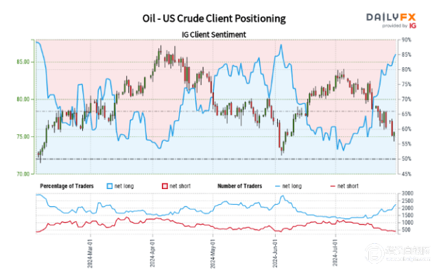 零售交易商数据显示,86.15%的交易商净做多美国原油,交易商做多与做空之比为6.22:1。净多头交易者数量比昨日增加5.20%,比上周增加15.22%;净空头交易者数量比昨日减少10.72%,比上周减少31.94%。
