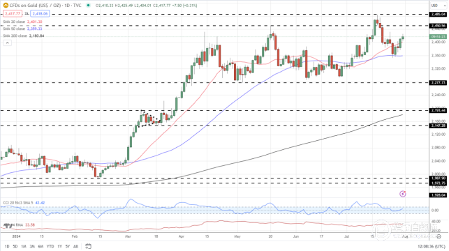 黄金已经收回了近期抛售的一半左右,并正在向2450美元/盎司阻力位回落。这一水平在7月中旬被打破,之后金价大幅下跌,并回落至数月交易区间。中东紧张局势加剧,或鲍威尔的鸽派表态,将令黄金测试之前的阻力位,并测试最近几十年来的高点2485美元/盎司。
