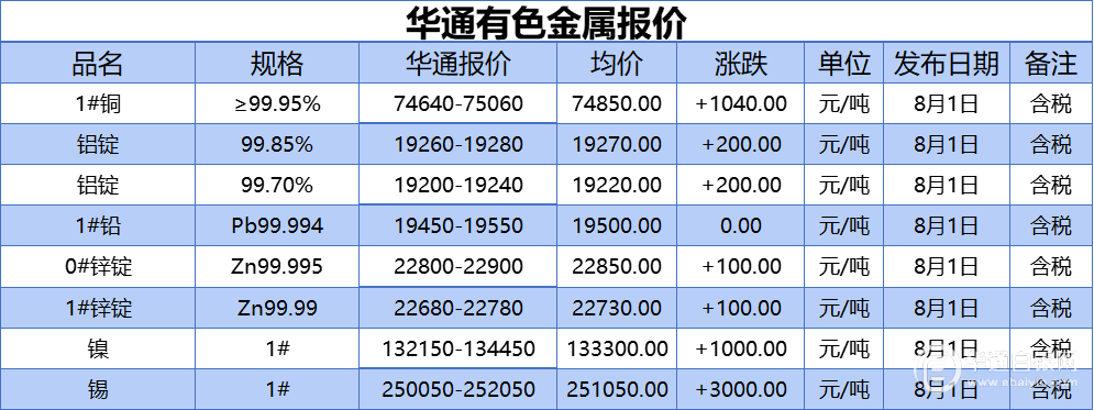 华通网8月1日讯:1#、铝锭(99.85%)、铝锭(99.70%)、1#铅、1#、0#锌、镍、锡报价