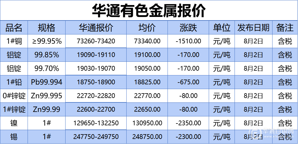 华通网8月2日讯:1#、铝锭(99.85%)、铝锭(99.70%)、1#铅、1#、0#锌、镍、锡报价