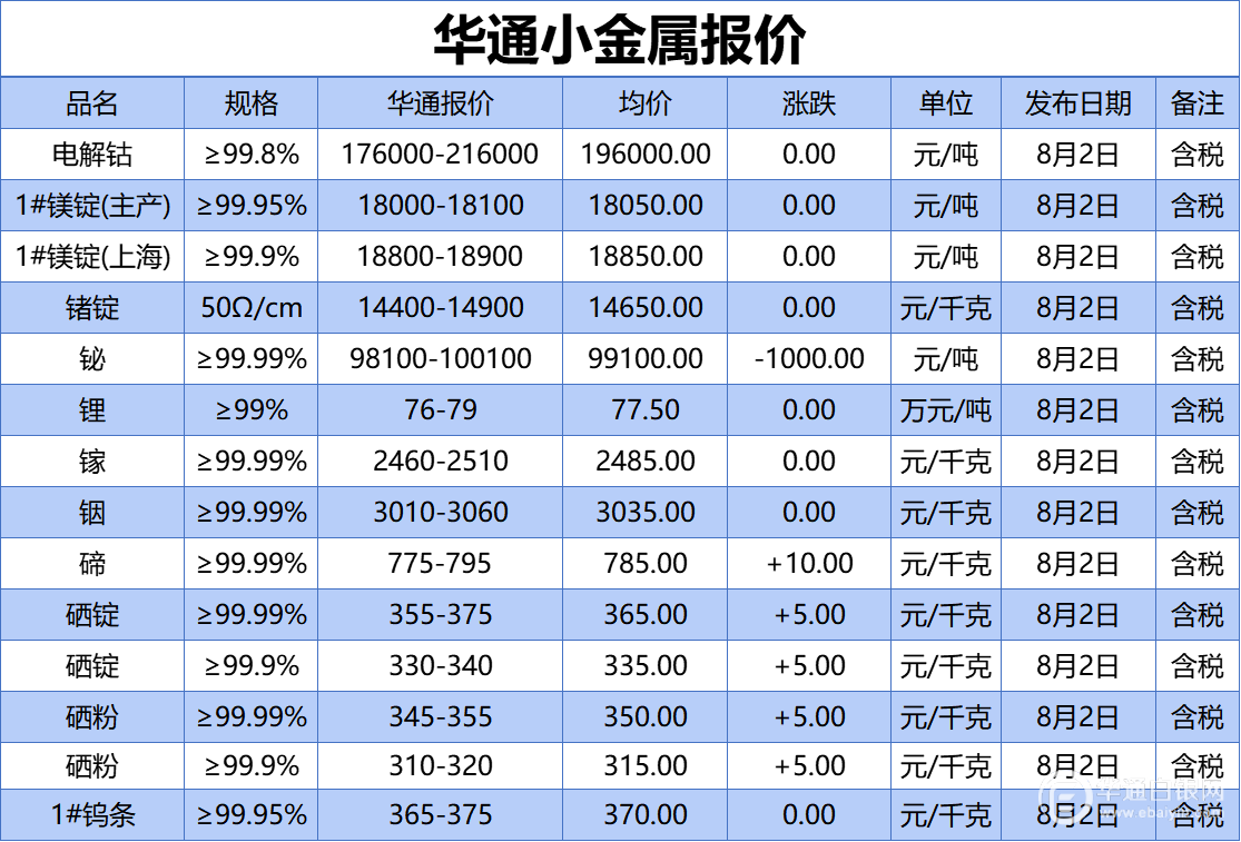 华通网8月2日讯:、1#镁锭(生产)、1#镁锭(上海)、锗锭、铋、锂、镓、铟、碲、硒锭(99.99%)、硒锭(99.9%)、硒粉、硒粉(99.9%)、1#钨条报价