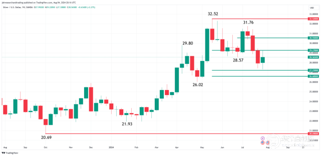 【华通网8月5日讯】•银价有望延续28.56美元上方的涨幅,如果看涨势头持续,则有可能测试30美元