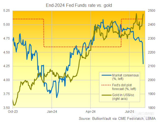 (芝加哥商品交易所期货市场对2024年底美联储利率预测与以美元计价黄金图表)