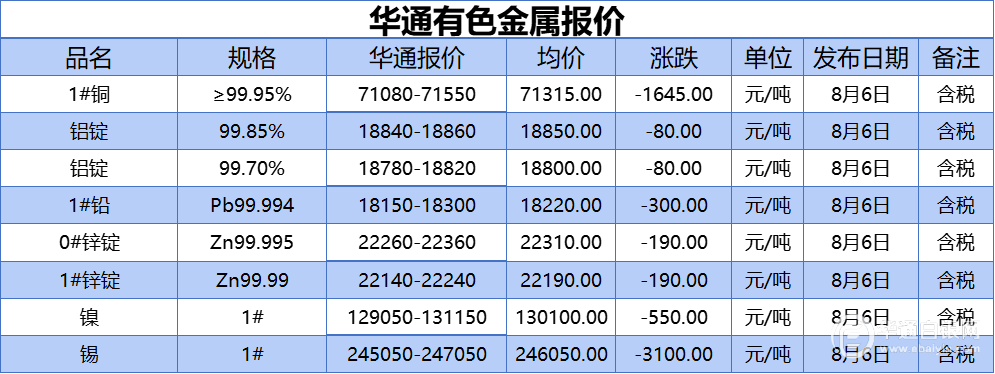 华通网8月6日讯:1#、铝锭(99.85%)、铝锭(99.70%)、1#铅、1#、0#锌、镍、锡报价