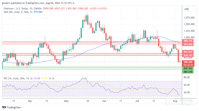 如果铂金保持在910美元以下,则将继续向最近的支撑位880-890美元区间移动。