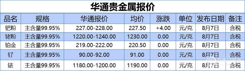 华通网8月7日讯:、、铂金、钌、铱报价