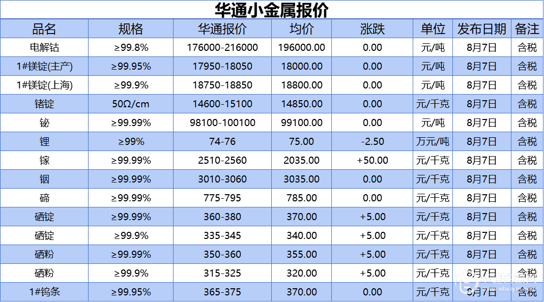 华通网8月7日讯:、1#镁锭(生产)、1#镁锭(上海)、锗锭、铋、锂、镓、铟、碲、硒锭(99.99%)、硒锭(99.9%)、硒粉、硒粉(99.9%)、1#钨条报价