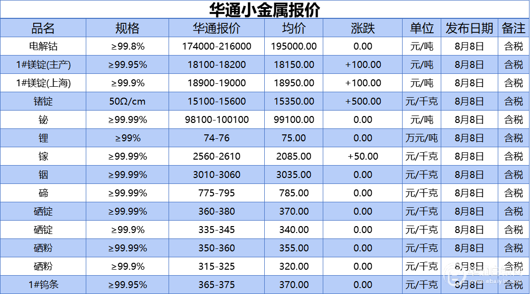 华通网8月8日讯:、1#镁锭(生产)、1#镁锭(上海)、锗锭、铋、锂、镓、铟、碲、硒锭(99.99%)、硒锭(99.9%)、硒粉、硒粉(99.9%)、1#钨条报价